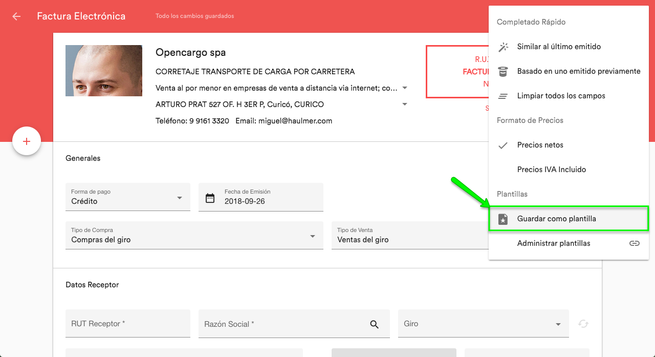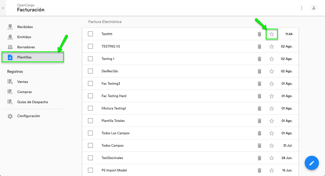 Efectivamente, es posible agilizar la emisión recurrente de documentos a través del uso de Plantillas. Las plantillas se crean y guardan en la emisión de un documento, para luego utilizarlas desde la Sección Plantillas. Desde ese lugar, puedes también eliminarlas o marcar alguna como predeterminada por tipo de documento (que se cargue automáticamente cada vez que abras la interfaz de emisión de documentos de ese tipo).