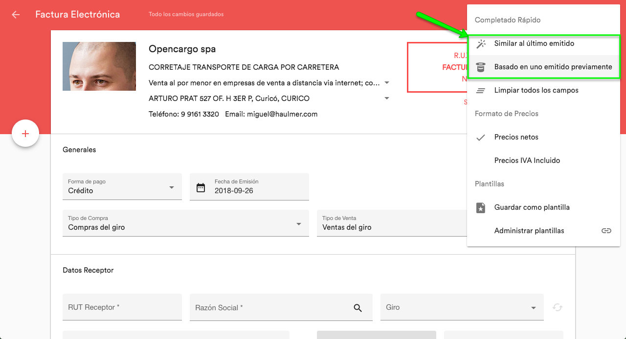 Por otro lado, la opción de crear un documento a partir de uno emitido anteriormente ya existe en nuestro sistema también, se llaman opciones de completado rápido. Puedes acceder a ellas desde el menú destacado en la imagen adjunta.