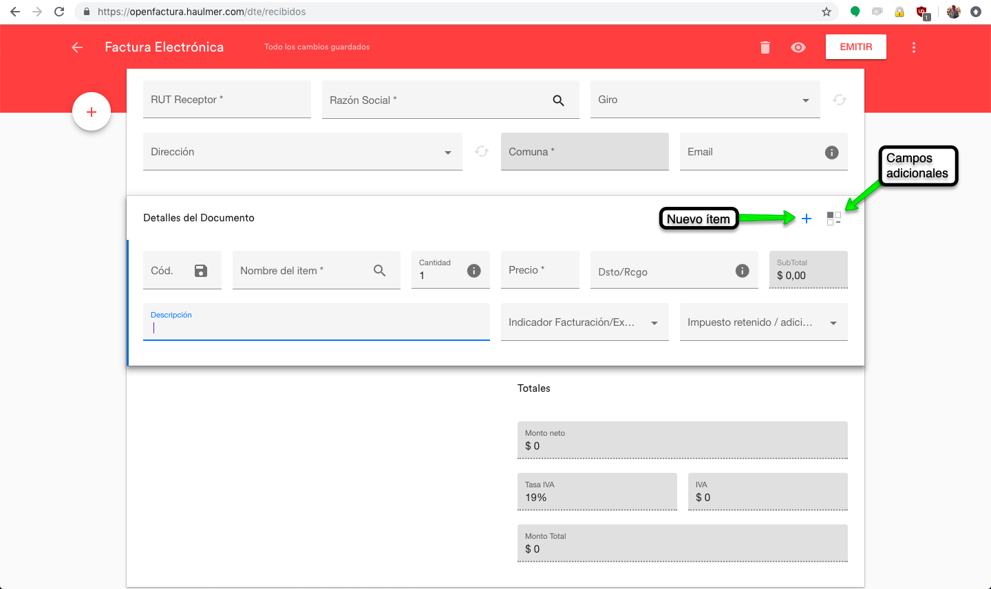 En el formulario de emisión de documentos, se puede agregar una descripción por ítem de hasta 1000 caracteres (Campo adicional). Puedes agregar hasta 60 ítems distintos, siempre y cuando el documento no supere una hoja de extensión.